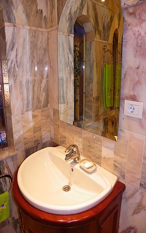 Bäder in Carrara-Marmor in beige-weiß bis leicht dunkel geflammt, Treppen und Terrassen in Antik-Terrakotta, Wohnraum in Schiffsplankenparkett- Marangoni/Eiche.